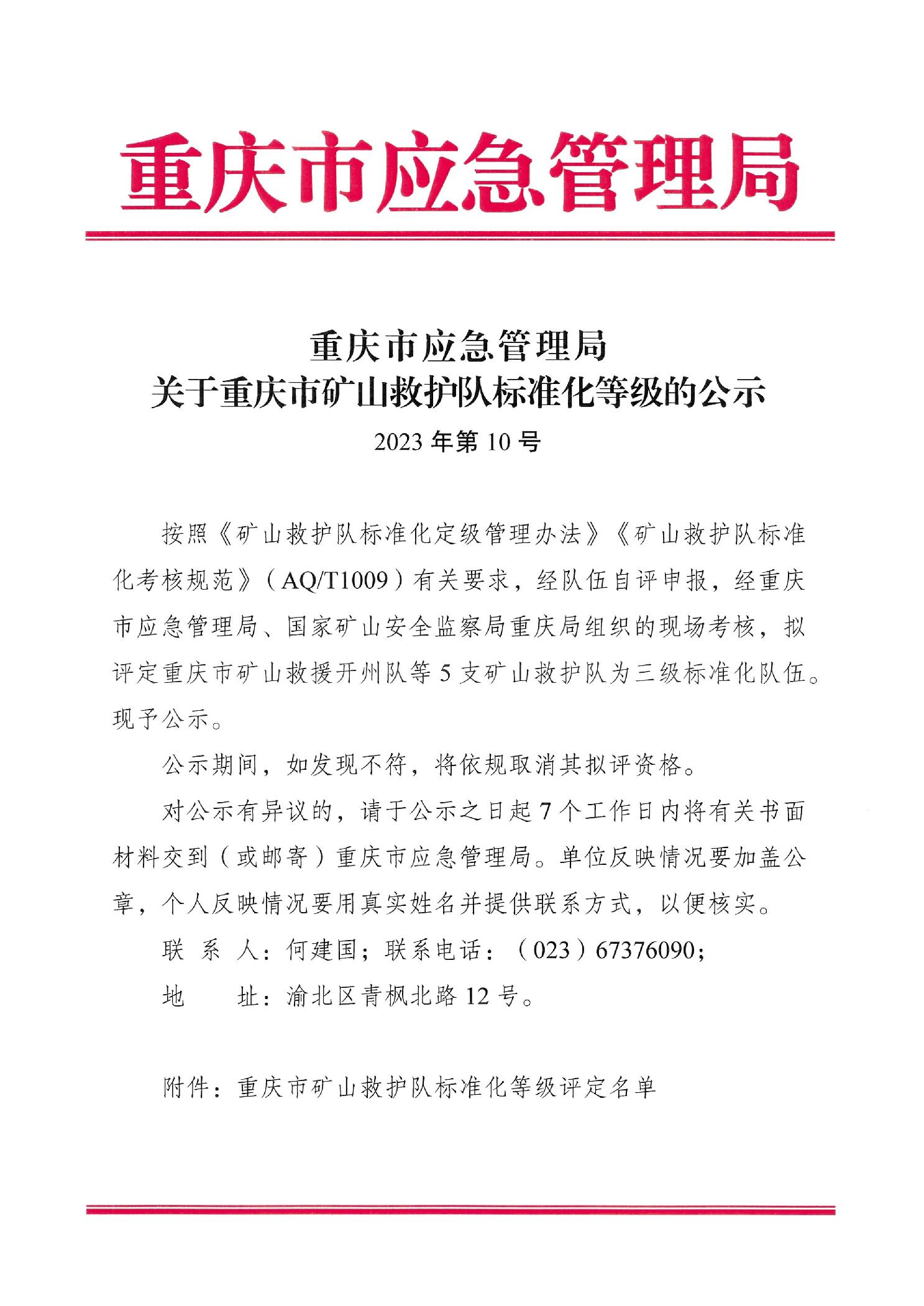 重庆市应急管理局关于重庆市矿山救护队标准化等级的公示