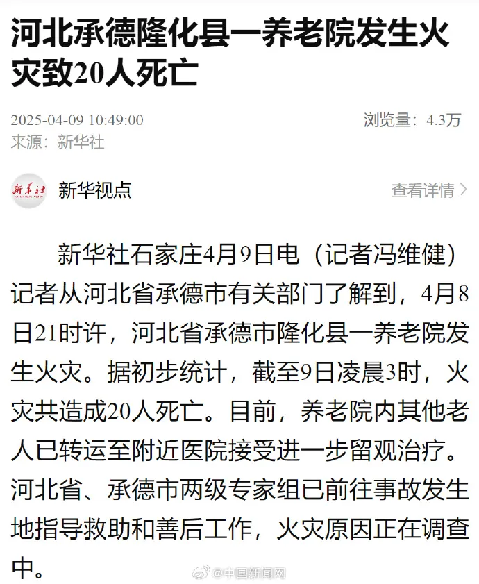 2025年4月8日21时,河北省承德市隆化县某养老院突发火灾。据初步统计,截至9日凌晨3时,火灾共造成20人死亡。幸存者被紧急转移至医院。这是继2015年河南鲁山养老院火灾(38人死亡)后,我国又一起重大养老机构火灾伤亡事件。